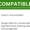 About this item EXACT FIT – Perfect replacement for IKEA Part #114334 Many Different Uses – Essential for home improvement projects and mostly tailor-made replacement for IKEA hardware items like Lack and Malm. Ideal for a wide range of applications including hanger bolts for console table, high bed frame, dressing table, and storage bed Pack of 4 – Each piece is precision manufactured with zinc plated steel IT WORKS OR WE MAKE IT RIGHT – We believe in the quality of our hardware. If any of our Spare Hardware Parts products don’t meet your expectations, simply let us know and we will refund your order – it’s as easy as that!